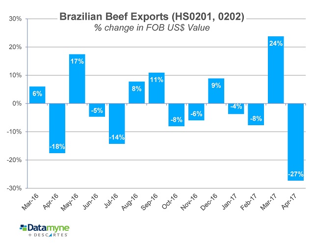 Still, Brazilian beef exports were expected to take a hit when news of the investigation broke. Our latest trade data provides a measure of the damage: the value of Brazilian meat exports dropped 18.9% from March to April. This April, exports were down 9% compared with April of last year.