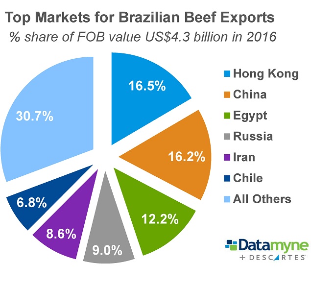 With few exceptions, the top country markets for Brazilian beef joined in the cutbacks. As the pie chart illustrates, Hong Kong and China split nearly a third of Brazil’s 2016 beef export sales between them. In March, both placed temporary import bans on Brazilian meats.